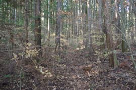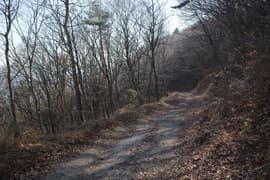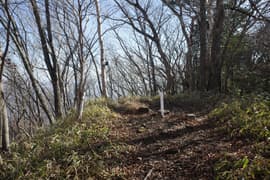 1055m標高点峰へ少し登り返し、冬枯れの雑木林に覆われた稜線を辿ってピークを越える。再び丈の低い笹原が下生えの杉植林に入り、緩斜面を下ると林道に出る。この地点に道標はない。林道の路面にはキャタピラの跡が新しく、工事用車両の往来があるようだ。