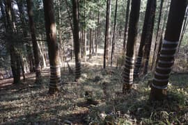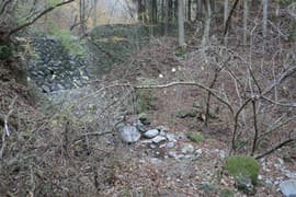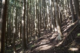 神社の左脇の作業道を上ると、すぐに左に簡易水道の施設を見て、杉林中の細い山道に入る。谷間に入って右岸の山裾を進み、石組みの砂防堰堤の下で水の少ない渓流を跨いで左岸に渡る。