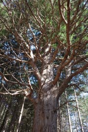 小さな枝尾根を越える所に2本の杉の大木があり、その下に潰れた石祠がある。ガイド本に御神木と記されている杉の木で、その名に相応しい風格がある。