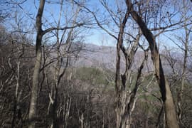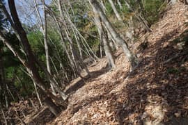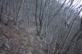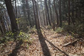 この山道は、昔はよく歩かれていたようで、幅広く堀割り状となっている区間もある。冬枯れの雑木林の中、陽が差し込んで明るく、落ち葉をカサコソと踏んで気持ち良く下る。