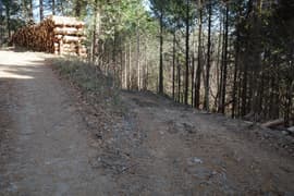 林業作業現場(今日は休業)があり、道端に整然と積み上げられた丸太を横目に通過。左後ろへ分岐する林道に入る。この地点には送電線巡視路の「沼原線No.37 8」と記した標識がある。