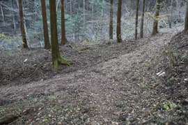 左岸の山腹を斜め右上に登ると「←安戸山へ」という道標がある。大きくジグザグを切りつつ、杉植林の山腹の高い所をトラバースして谷間の奥に入って行く。道型ははっきりしているが、枯れ杉の葉に覆われて、歩く人は多くない様子。日陰の道が続いて、歩いていても冷え込みを感じる。