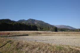 涸れた渓流を渡り、舗装道を歩くと山麓の畑地に出て、鷹八幡宮の石鳥居の前の十字路に着く。十字路を右折して、畑地の中を歩く。車を置いた駐車地までは僅かの距離だ。振り返ると安戸山の頂や、山裾の鷹八幡宮の白い鳥居が見える。