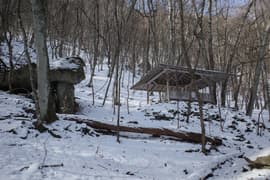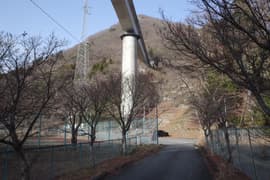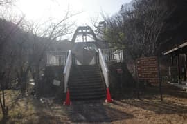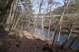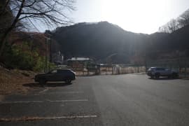 川治湯元駅から日光市営の共同浴場「薬師の湯」へ降りて、薬師の湯のすぐ手前の川治テニス場の駐車場に車を置く。先行者のものらしき車が1台。天気は快晴。外に出ると寒いことは寒いが、風がないのは幸い。頭上高く野岩鉄道の橋が架かり、全山が冬枯れの樹林に覆われた南平山も仰ぐことができる。南平山の頂上付近には白い雪が薄らと見えている。今日は軽アイゼンやスパッツ等の雪山道具は持って来ていないが、大した積雪ではなさそうなので何とかなるだろう。動けばすぐに温まるから、ULDジャケットはザックにしまって、厚手の長袖シャツで歩き出す。