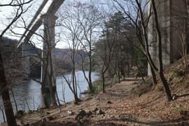 薬師の湯の手前から鬼怒川に架かる黄金(こがね)橋を渡り、龍王峡に至るハイキングコースに入る。橋名は南平山に伝わる黄金埋蔵伝説に因んでいる。橋上からは鬼怒川と男鹿川の合流点や、男鹿川を挟んで薬師の湯と温泉街が眺められる。薬師の湯の背後の山は浅間山といい、登山道があるそうな。小さいながらも岩山で、ちょっと興味を惹かれる。