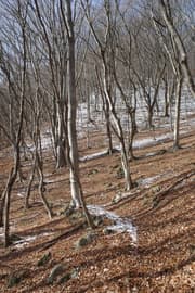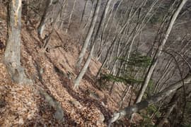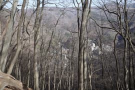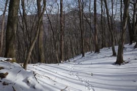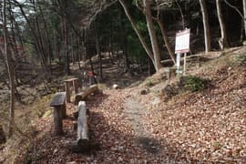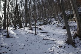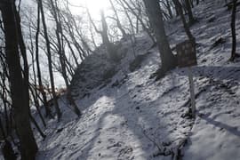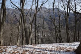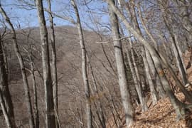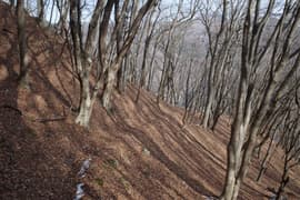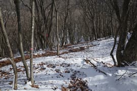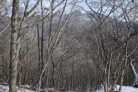 登山道は薄暗い針葉樹林を抜けると冬枯れで明るい雑木林の斜面に入り、急斜面をトラバースして登る。幅狭い山道で、落ち葉に覆われているが道型ははっきりしている。なかなか野趣に富む楽しい道だ。高度が上がると、木立を透かして川治温泉駅付近の街並みが俯瞰できる。