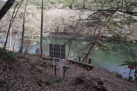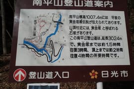 園地を通り抜け、左手に鬼怒川の小網ダム上流部の幅広い水面を眺めながら、落ち葉が深く積もったハイキングコースを辿る。野岩鉄道の高架橋の下を潜ると、程なく南平山登山口に着く。ここにはベンチや道標の他、日光市が設置した「南平山登山口案内」の看板がある。案内によると頂上まで約3km、登り2時間となっている。