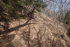 急斜面をジグザグに登り、尾根の左斜面をトラバースする。行く手には木の間に南平山の頂上部を仰ぐ。程なく尾根上の平坦部に登り着く。尾根の反対側には、すぐ下に川治ダム・川俣温泉方面に向かう県道川俣温泉川治線が通じているのが見え、そちら側から上がって来る踏み跡もある。