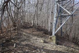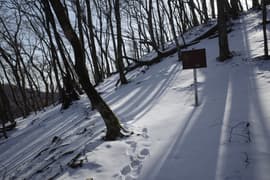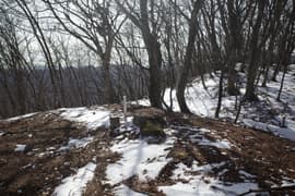 尾根道をゆるゆると登り、送電鉄塔の脇を通過。頂上まで2.4kmの道標を見て、尾根の右斜面のトラバース道を進む。この辺りから、日陰に薄く積もったザラメ状の雪を見る。北側の斜面に入ると北風が吹き上がって来て、一段と寒い。