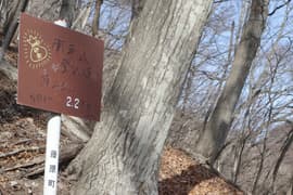 0.2km毎に旧藤原町が設置した道標があり、次は頂上まで2.2kmの道標を見る(後日調べると、藤原町は2006年に合併して、現在は日光市の一部)。どの道標も文字が掠れて、白字の距離と「砂金」と記した巾着の金色でペイントされたイラストだけがくっきりと読み取れる。