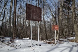 頂上には旧藤原町が設置した「南平山の黄金埋蔵伝説」の説明板がある。曰く、源平の戦いに敗れた平家の大将が南平山のどこかに軍資金を埋め、その場所を表すカギとして「朝日さす夕陽輝くこのおかに漆千杯黄金千杯」という歌を残した、とのこと。三角点標石はそのすぐ先にある。