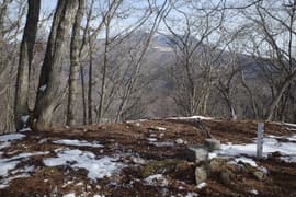 頂上は小広く、樹林に囲まれているが、この時期は冬枯れで明るい。木の間を透かして川治温泉を俯瞰し、高原山も見えて、意外と展望が得られる。木立には懐かしいN氏山名標識が架かる。設置されてから、多分20年くらいは経っているのでは。手彫りの白文字も流石に消えた箇所が目立つ。