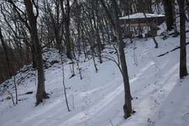 頂上直下の急坂の雪道を滑らないように注意して下る。東屋は下りも通過。雪が消えると少し安心して歩けるが、まだまだ急斜面のジグザグの下りが続き、気が抜けない。眼下の川治温泉に向かってグングン高度を下げる。