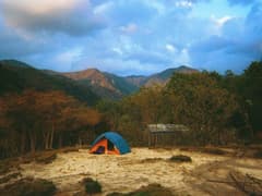 小屋の背後には広い草地と砂地があり、絶好のテントサイトだ。早速、テントを張る。谷間にもかかわらず、周囲の展望があり、鋸山、皇海山、三俣山、大平山と、紅葉の山々にぐるりと取り囲まれていある。すぐそばには小川が流れ、水には困らない。この晩は夜半に雨が降り、寒かった。