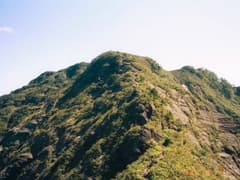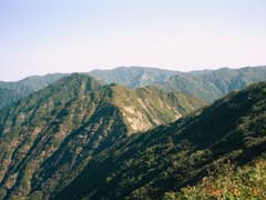 光明山まで1時間20分との標識があり、まだ遠いのでちょっとあせる。下田の山々と深くV字に切れ込んだ渓谷、スラブを見ながら光明山へ縦走。スラブのトラバース、岩稜が続く。フイゴのたて負いという岩場を登ると中光明山のピークで、右38分光明山と記した石の標識があった。